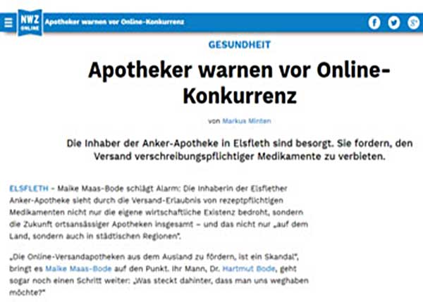 Hier finden sie einen sehr interessanten Artikel der Nordwestzeitung (NWZ-Online) über die Gefahr der Online Apotheken.