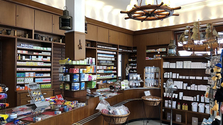 Keine 95, aber immerhin über 60 Jahre hat das die Holzeinrichtung schon hinter sich: Ein Tischler aus Brake hatte sie 1958 speziell für die Apotheke angefertigt. Zwischendurch wurde sie modernisiert, hat ihr Erscheinungsbild aber erhalten. Selbst die Beleuchtung ist maritim: Über dem HV hängt ein weiteres Steuerrad samt mundgeblasener