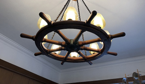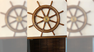 Glaskuppeln. „Das ist von einem Segelschiff, dessen Namen ich nicht kenne, aber es ist definitiv ein echtes Steuerrad“, sagt die Inhaberin.